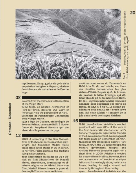 Contributions by Yveline Alexis, Kyrah Malika Daniels, Nathalie David, Jean-Ulrick Désert, Hans Fässler, Sasha Huber, Zainabu Jallo, Erol Josué, Dora Imhof, Sabine Lamour, Kettly Mars, Christopher Nixon, Katherine Smith, Gina Athena Ulysse, U5
